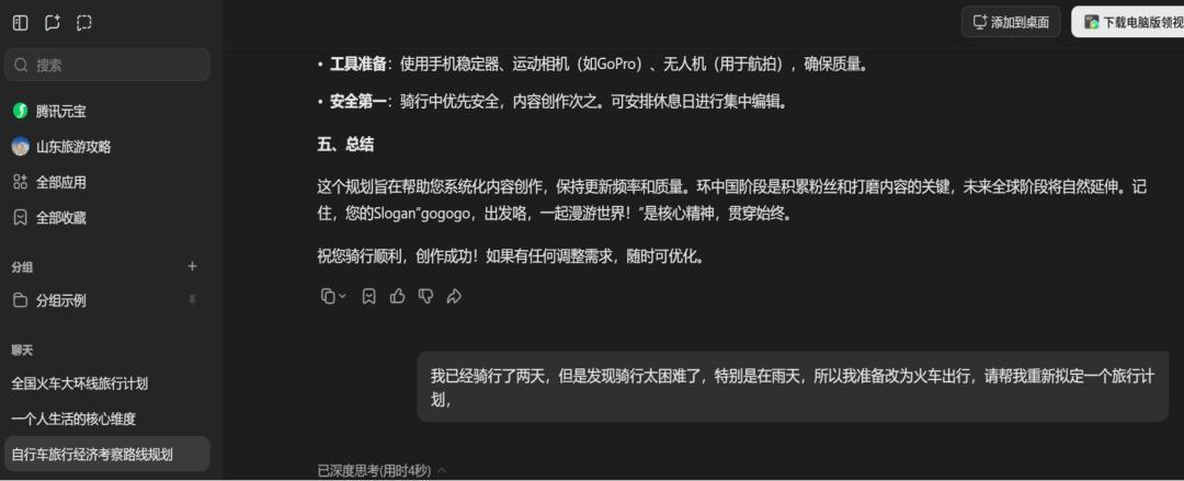 个人AI实操经验:分享我运用AI工具进行旅行规划、内容创作与智能体(Agent)搭建的具体案例。国内外AI产品观察:对比分析当前AI产品的发展现状与特点。AI发展趋势猜想:探讨技术演进方向及其可能带来的社会影响。个人的应对策略:面对AI时代的到来,我们应如何思考和行动。一、个人AI实操经验分享1. AI辅助长途旅行规划我目前正在进行一场坐火车环游中国的旅行。最初,我使用腾讯元宝AI助手规划了一次自行车全国旅行,并生成了详细的装备清单。然而,在实际骑行两天后,由于体力原因及广州的台风天气,我放弃了该方案。