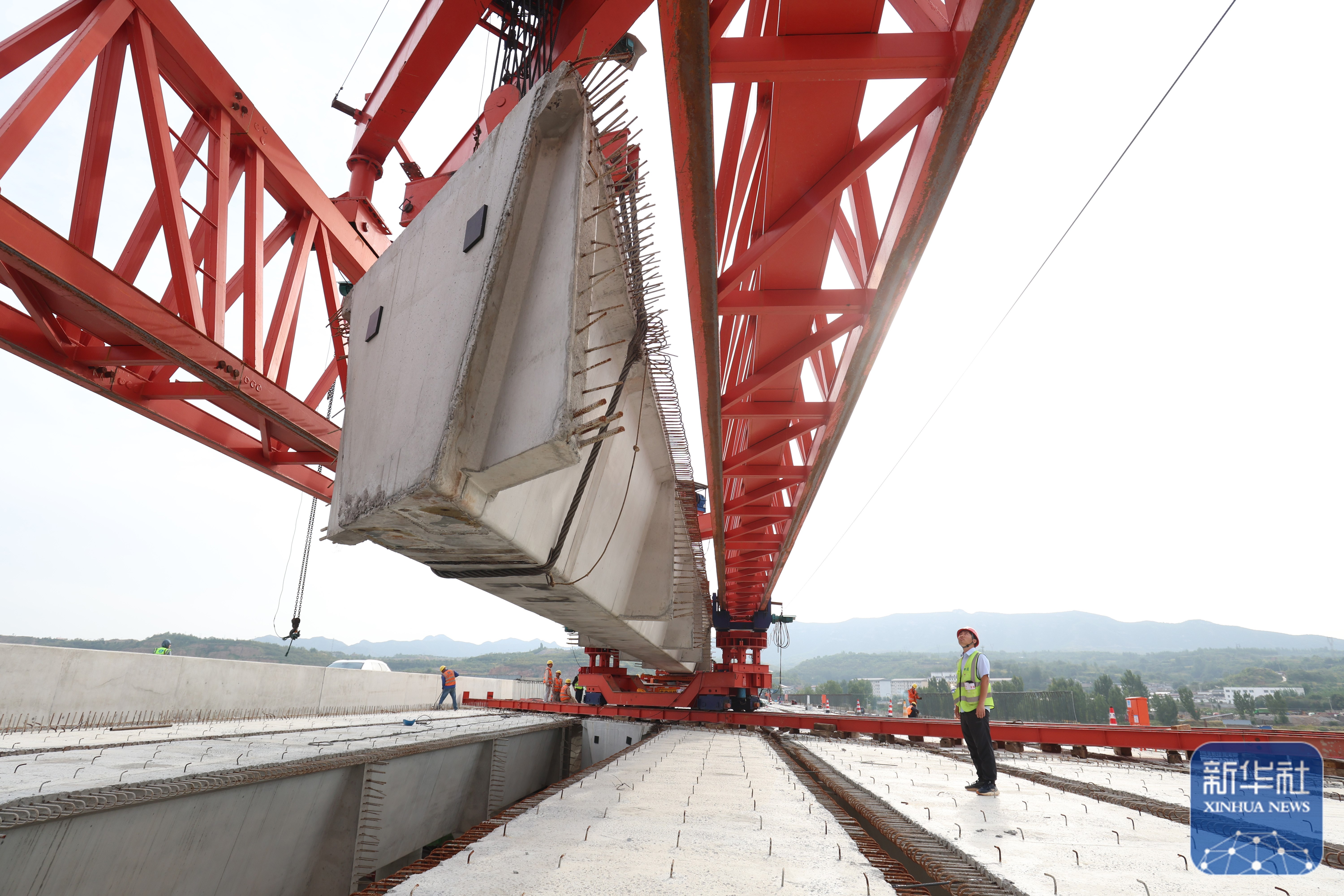 ↑ 10月1日,中铁十一局建设者在浙江省湖州市德清县杭德市域铁路高架线铺轨现场施工作业。新华社发(谢尚国摄)