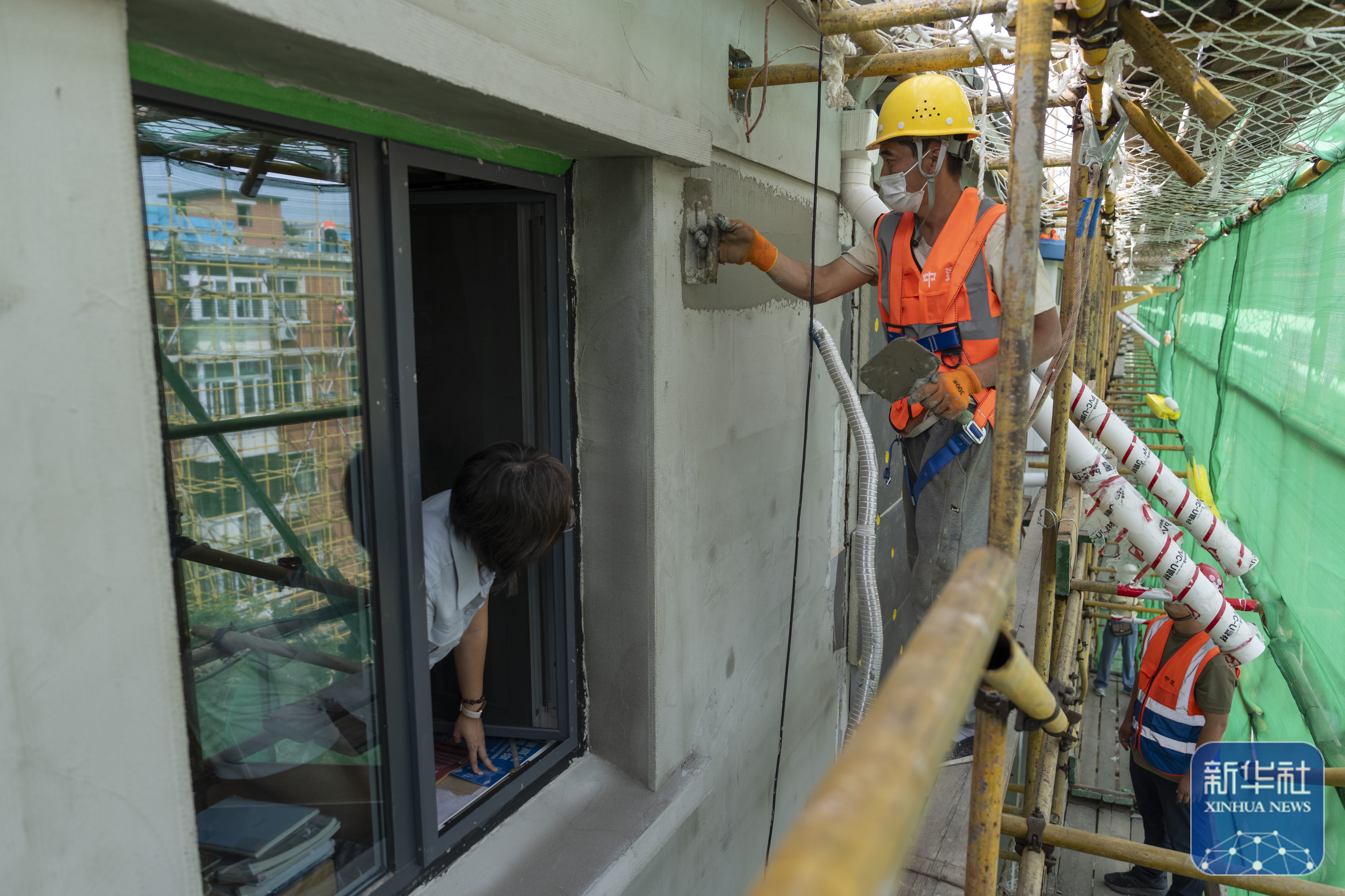 ↑ 10月1日,在北京东城区和平里街道,中建三局集团有限公司工人进行外墙保温板抗裂砂浆施工。新华社记者 才扬 摄