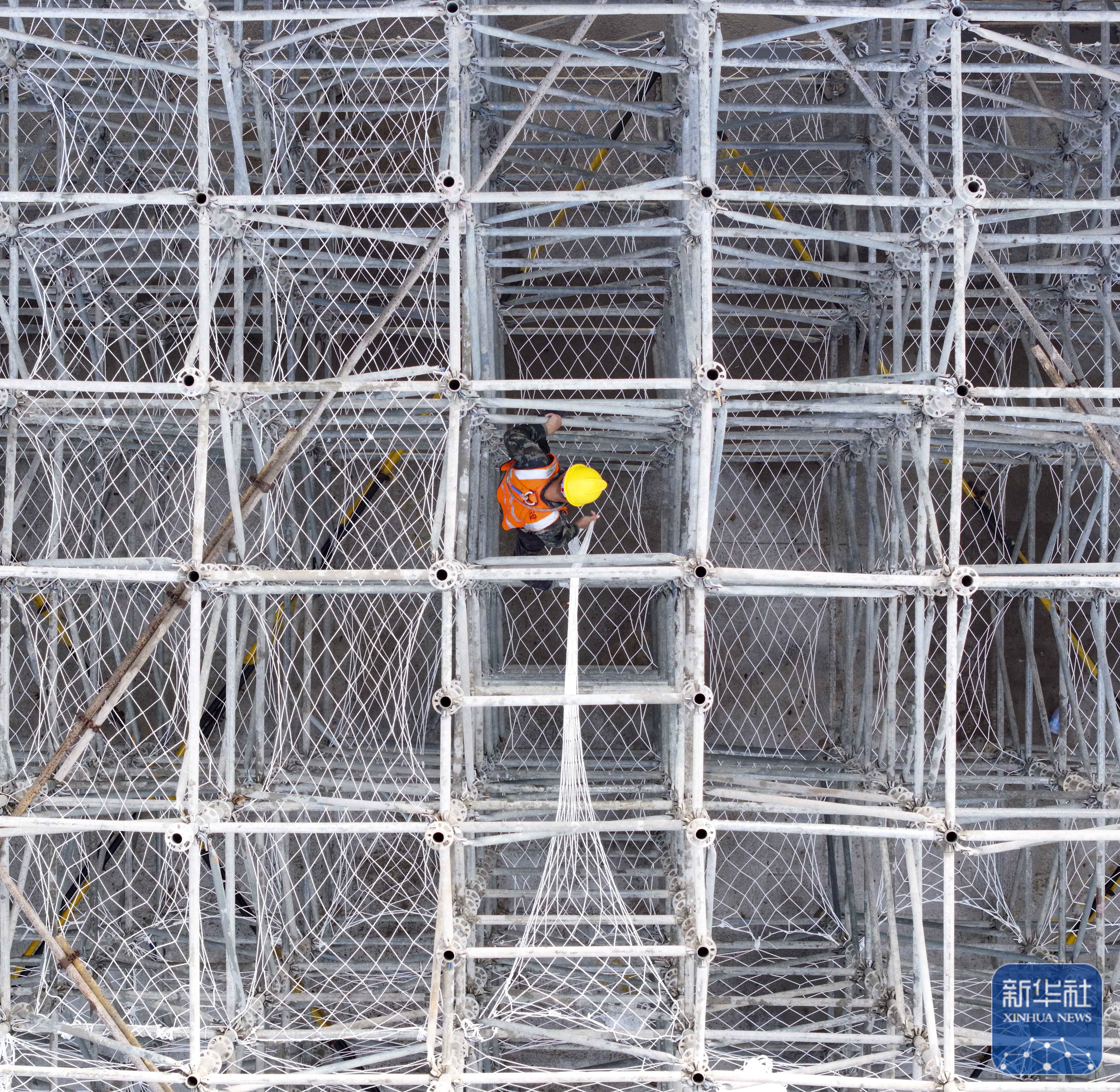 ↑ 10月1日,工人在江苏省泰州市高铁南站综合交通枢纽一项目为井字架安装防护网(无人机照片)。新华社发(顾继红摄)