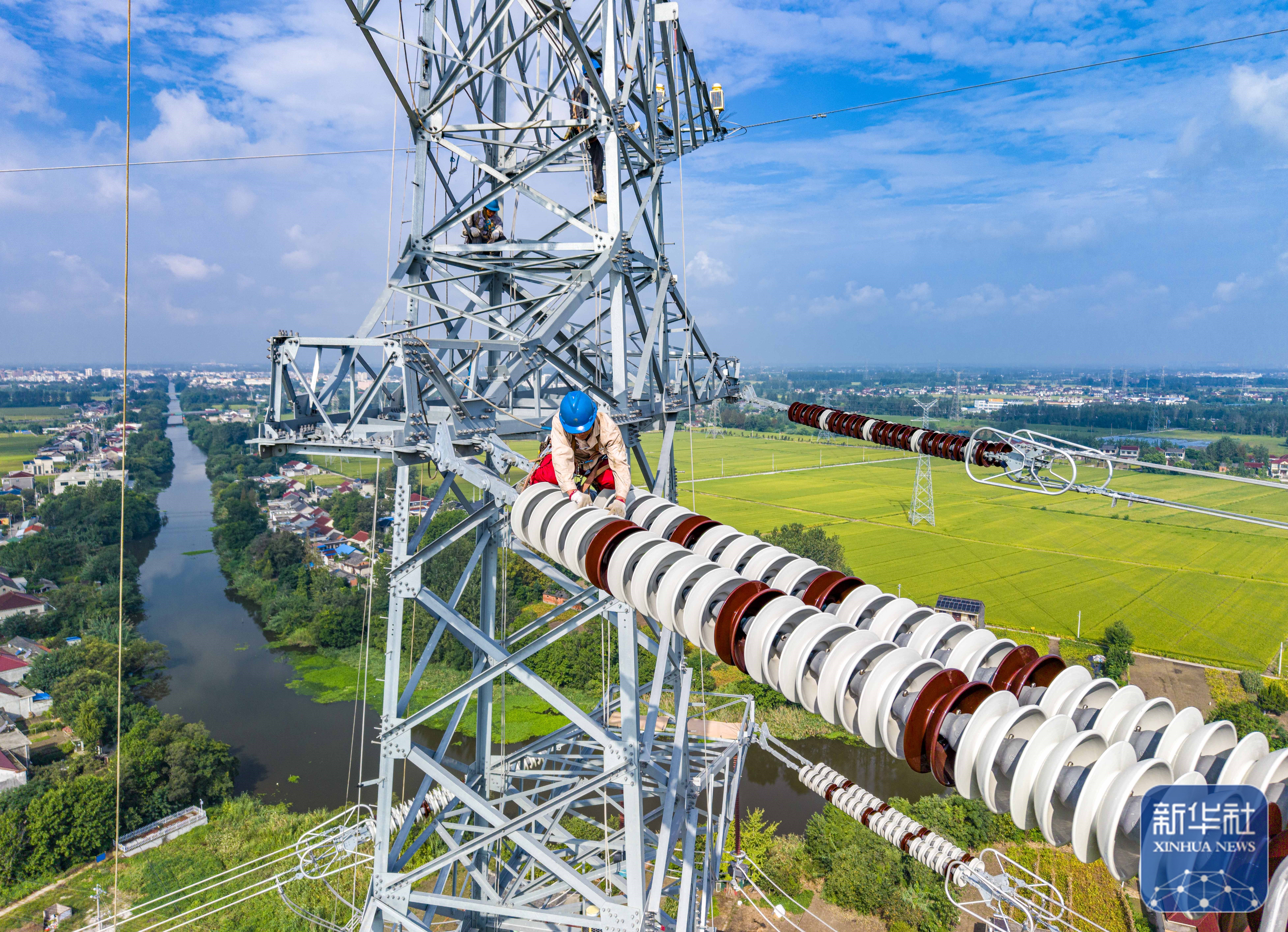 ↑ 10月1日,在江苏省扬州市江都区吴桥镇,电力人员在扬州-镇江±200千伏直流输电二期工程施工现场作业(无人机照片)。新华社发(任飞摄)