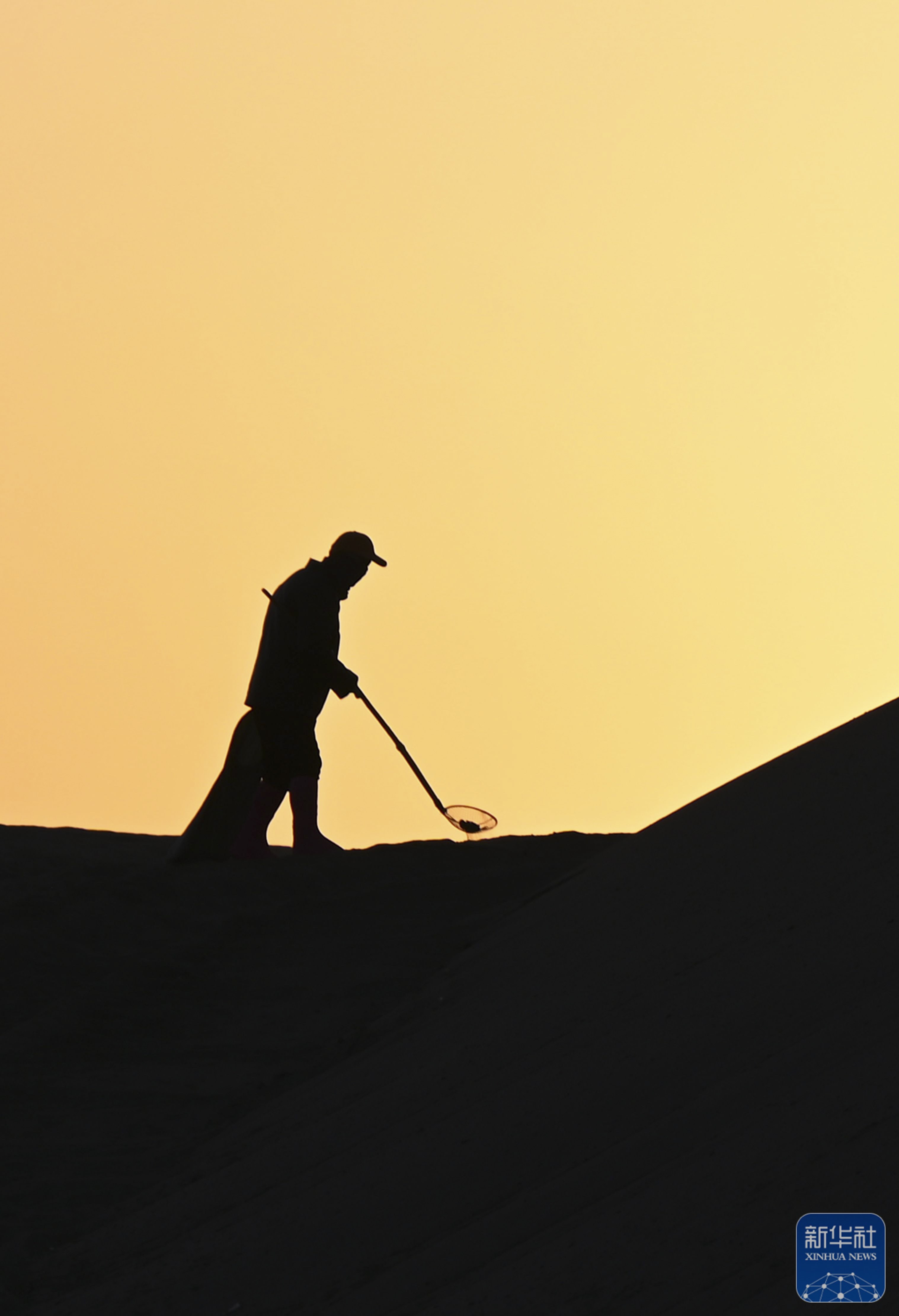 ↑ 10月1日,保洁人员在甘肃省敦煌市鸣沙山月牙泉景区保洁。新华社发(张晓亮摄)