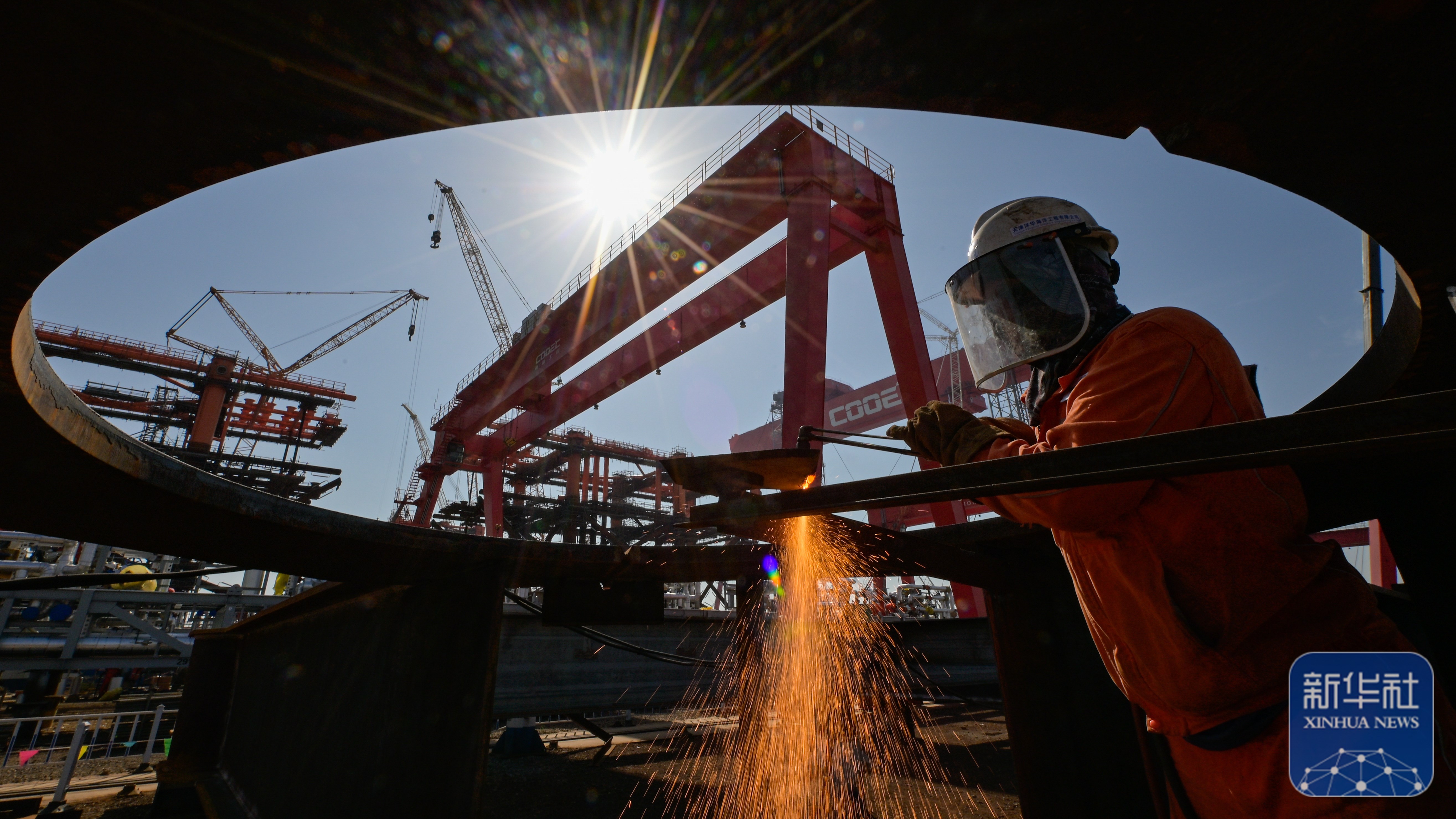 ↑ 10月1日,在天津市滨海新区,渤海油田工人进行气割作业。新华社发(杜鹏辉摄)